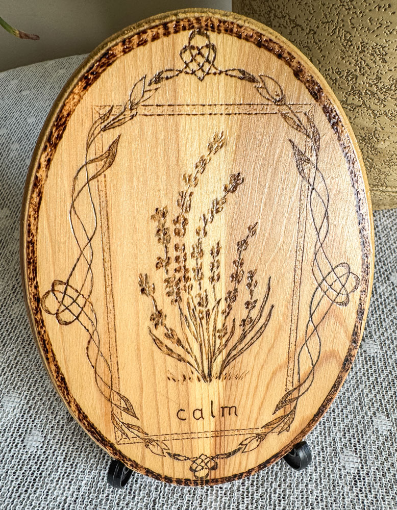 Invite a serene touch of nature into your home with this enchanting 6.5” x 4.5” oval wood-burned plaque, featuring a delicate lavender bush lovingly wood-burned and framed with a Celtic and Art Nouveau-inspired border.