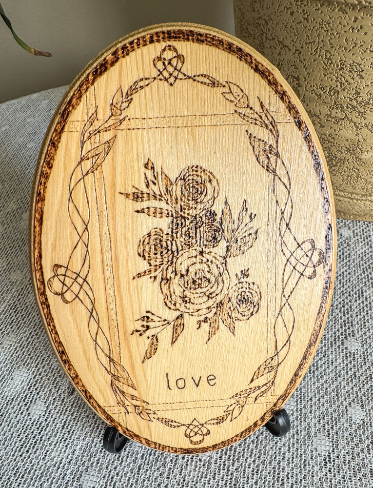 Bring a touch of enchantment and timeless romance into your home with this 6.5” x 4.5” oval wood-burned plaque featuring romantic roses. Each delicate bloom is lovingly framed with an elegant border inspired by Celtic and Art Nouveau artistry, creating a piece that’s both whimsical and sophisticated.